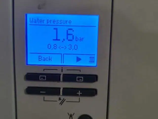 Central heating pressure Gauge Virtually all boilers have a pressure gauge on the front. Most of these are hydraulic dials, although you’ll find some have a digital display. Usually, you’d expect your boiler pressure to be around 1 bar if your heating is off, and around 2 bar when the heating is on and the system is warm.